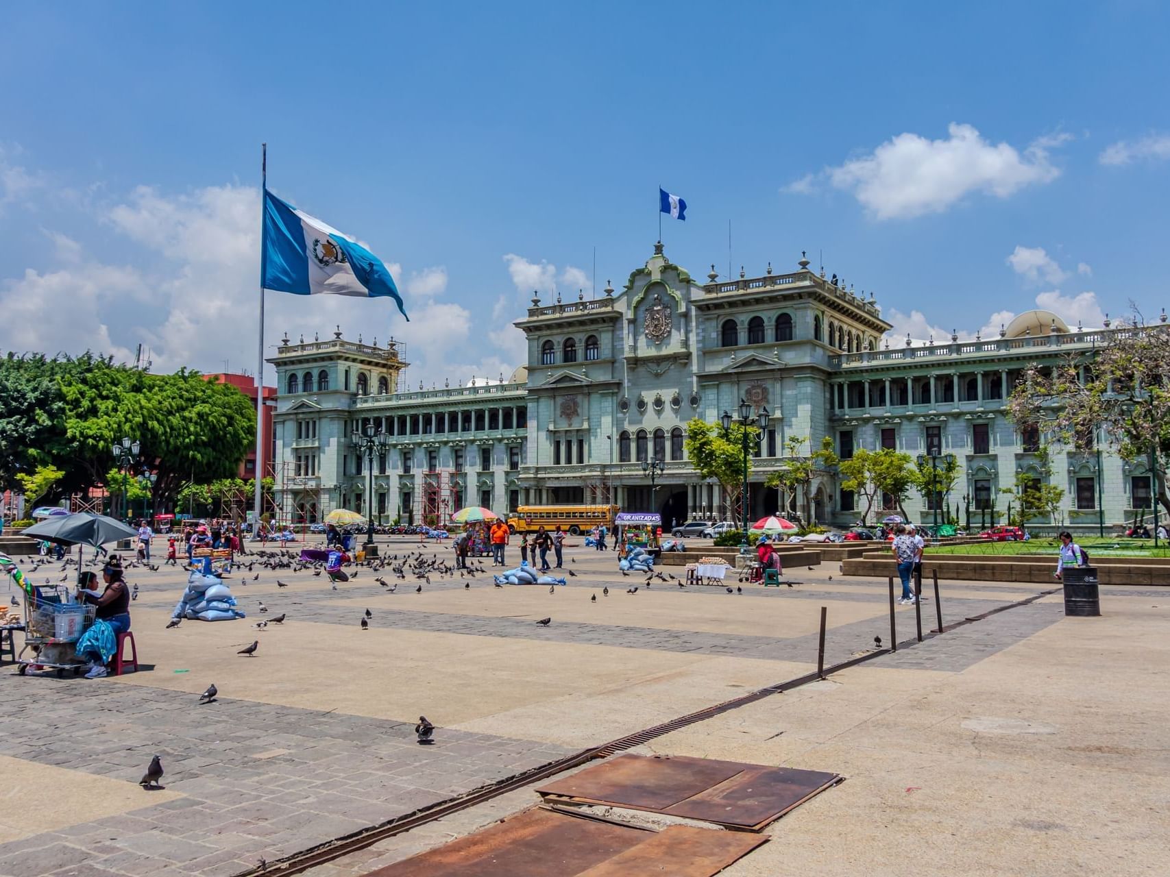 La Plaza de la Constitución, la mayor de Ciudad de Guatemala, está rodeada por algunos de los monumentos más emblemáticos de la ciudad, como el Palacio Nacional, la Catedral Metropolitana y la Biblioteca Nacional, lo que la convierte en el punto de partida perfecto para explorar el centro histórico.